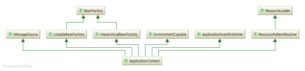 ListableBeanFactory(BeanFactory에 하위 인터페이스이며, Bean을 Listable하게 보관하는 인터페이스를 말한다. 대표적으로 DefaultListableBeanFactory 클래스)를 상속하고 있으며, 여러 기능(ResourceLoader, ApplicationEventPublisher, MessageSource, Bean Lifecycle)을 추가로 제공한다.