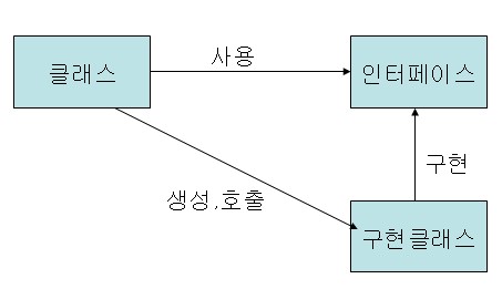 클래스를 인터페이스와 인터페이스를 상속받아 구현하는 클래스로 분리했다. 구현클래스 교체가 용이하여 다양한 변화가 가능하다. 그러나 구현클래스 교체시 호출클래스의 코드에서 수정이 필요합니다. (부분적으로 종속적)