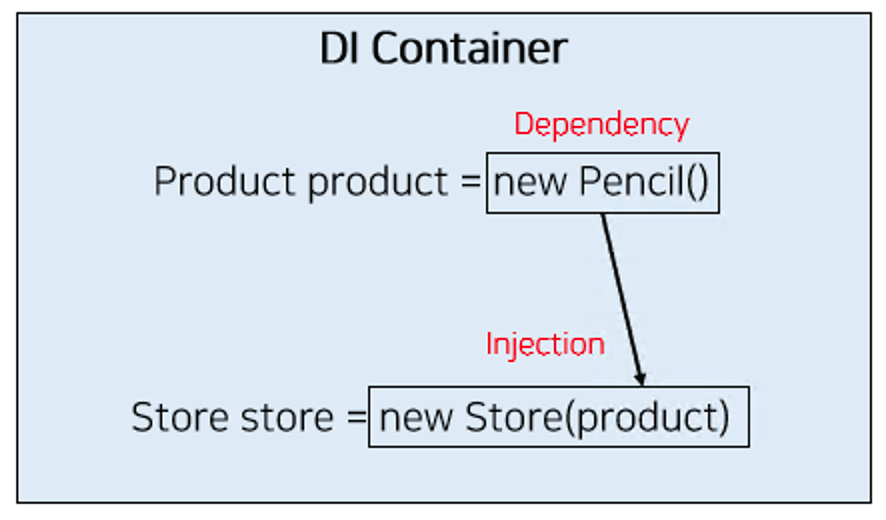 여기서 Spring이 DI 컨테이너를 필요로 하는 이유를 알 수 있는데, 우선 Store에서 Product 객체를 주입하기 위해서는 애플리케이션 실행 시점에 필요한 객체(빈)를 생성해야 하며, 의존성이 있는 두 객체를 연결하기 위해 한 객체를 다른 객체로 주입시켜야 하기 때문이다.