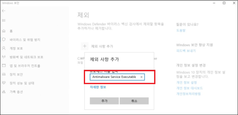 9. 이제 antimalware service executable 프로세스까지 검사항목에서 제외 하셨으면 윈도우 디펜더의 백그라운드 검사에서는 antimalware service executable 와 관련된 파일은은 검사 항목에서 빠지게 되므로 antimalware service executable 의 CPU 와 메모리 점유율 상승 문제는 발생하지 않을 것입니다.
