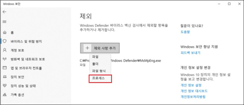 7. MsMpEng 파일을 제외했으면 다시 제외 사항 추가를 선택(클릭)한 후 이번엔 프로세스를 선택(클릭) 해 주시기 바랍니다.