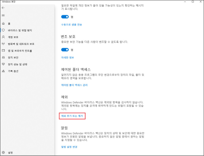 4. 바이러스 및 위협방지 설정에 들어가신 후 제외 설정에서 제외 추가 또는 제거 메뉴를 선택(클릭) 해 주시기 바랍니다.