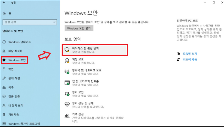 2. 업데이트 보안에서 Windows 보안을 선택한 후 바이러스 및 위협 방지를 선택해 주시기 바랍니다.
