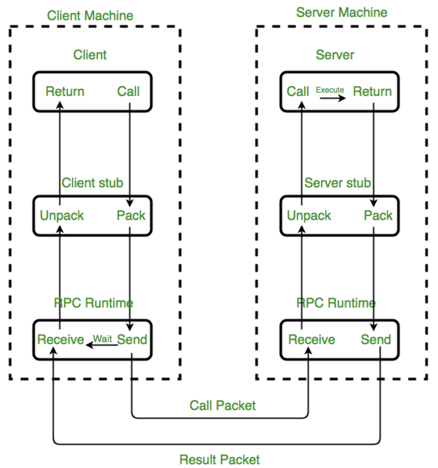 | Stub은 RPC의 핵심 개념이라고 볼 수 있음. 서버와 클라이언트는 서로 다른 주소 공간을 사용 하므로 함수 호출에 사용된 매개 변수를 꼭 변환해줘야함. 그렇지 않으면 메모리 매개 변수에 대한 포인터가 다른 데이터를 가리키게 됨. client의 stub은 함수 호출에 사용된 파라미터의 변환(Marshalling) 및 함수 실행 후 서버에서 전달 된 결과의 변환을 담당 server stub은 클라이언트가 전달한 매개 변수의 역변환(Unmarshalling) 및 함수 실행 결과 변환을 담당 |